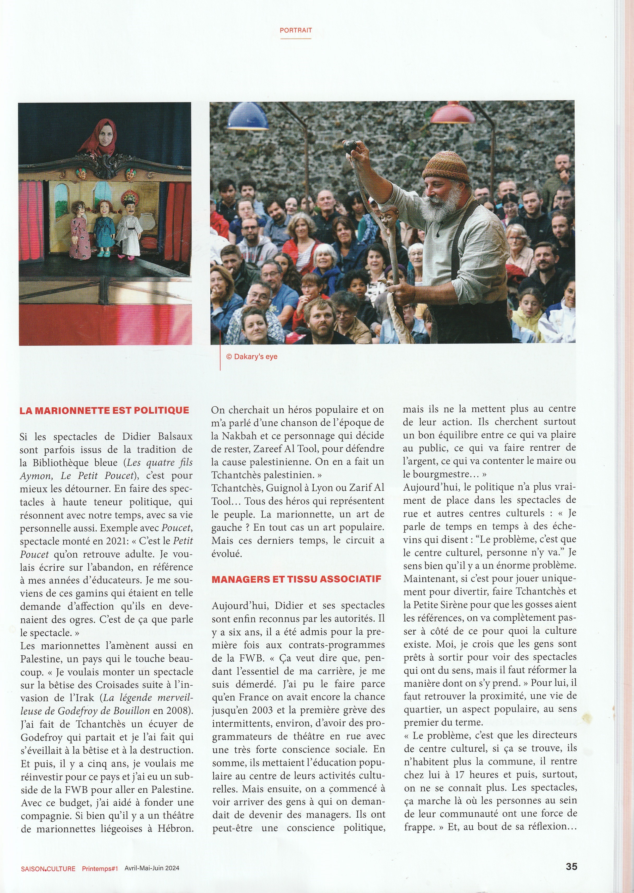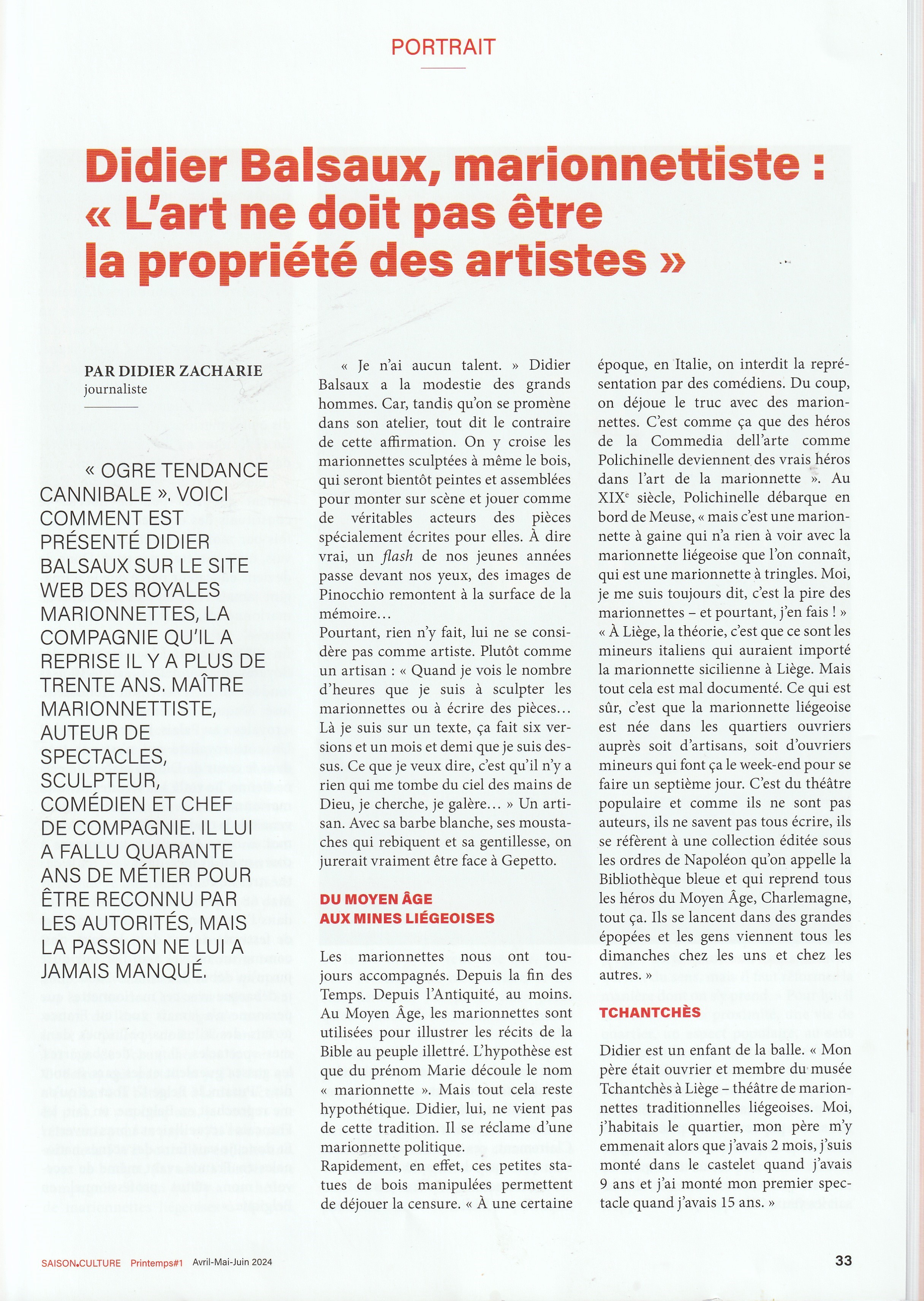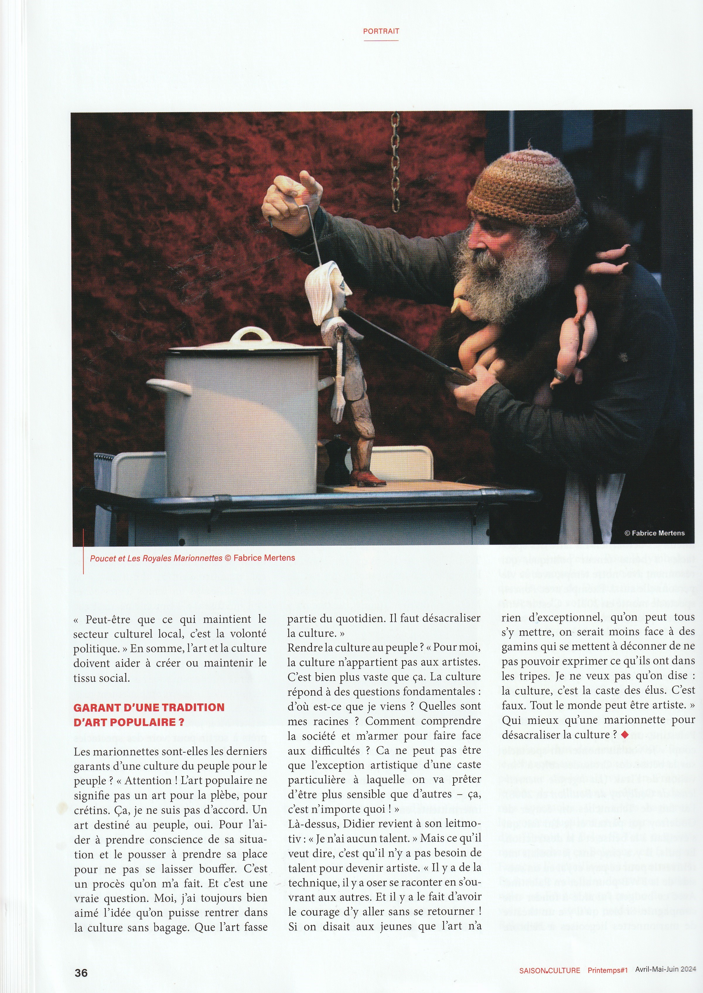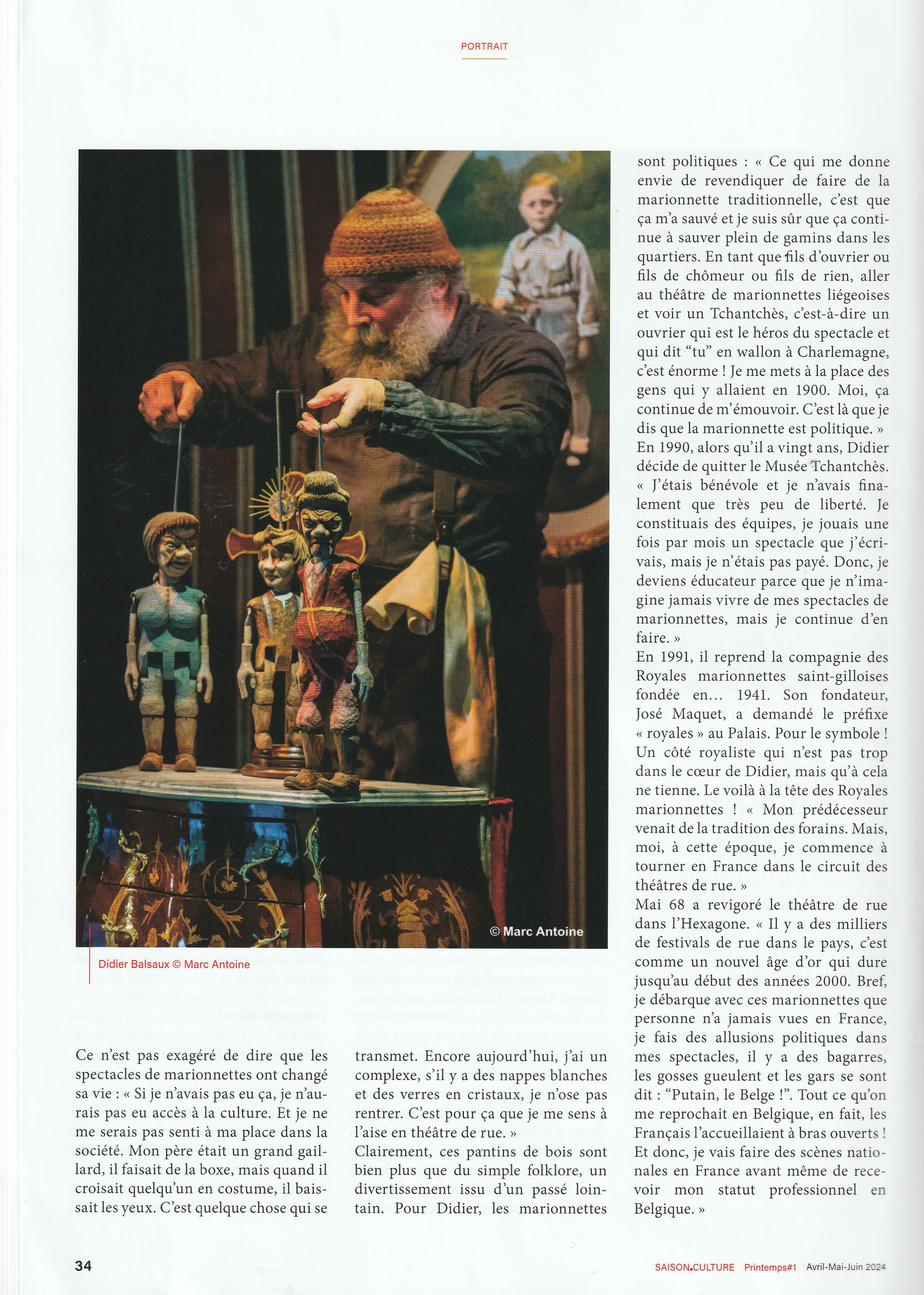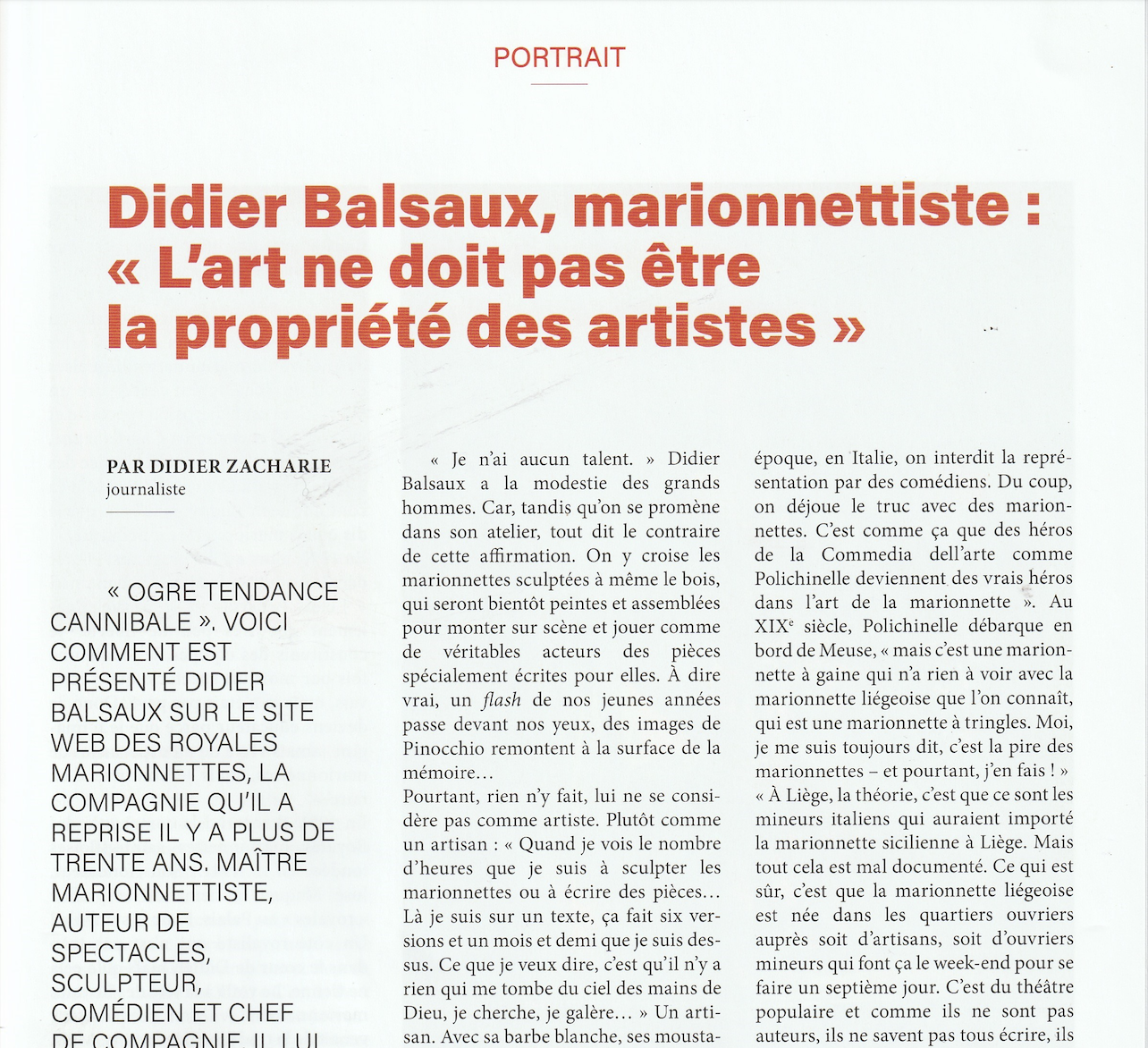 PORTRAIT : Didier Balsaux, marionnettiste: "L'art ne doit pas être la propriété des artistes" Article de Didier Zacharie.